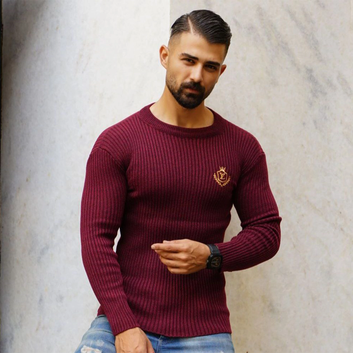 بافت یقه گرد کشبافت کبریتی زرشکی مدل Rama