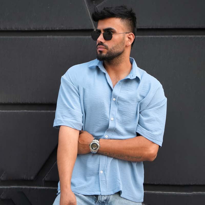 پیراهن آستین کوتاه آبی روشن مردانه مدل باکسی
